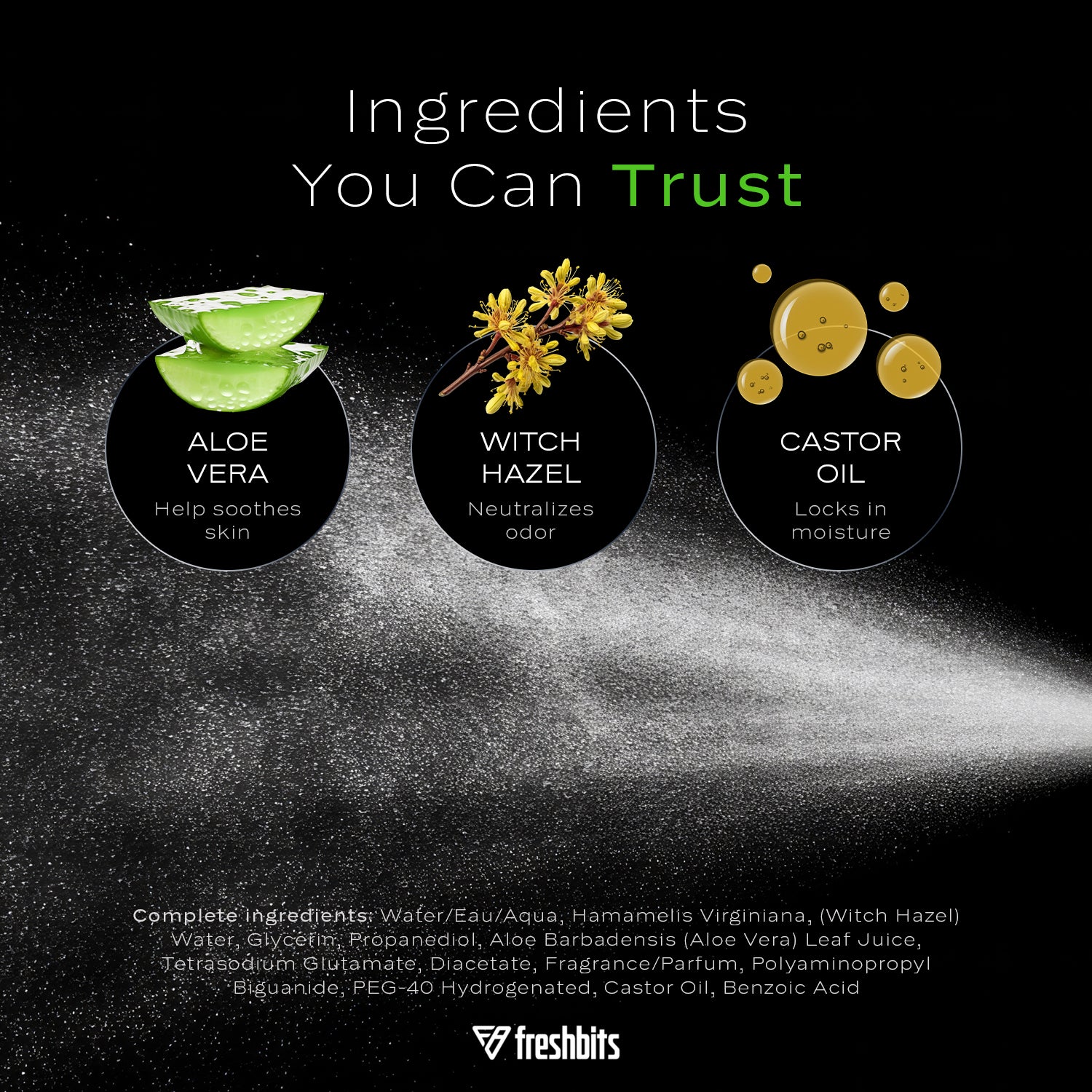 Water/Eau/Aqua, Hamamelis Virginiana, (Witch Hazel) Water, Glycerin, Propanediol, Aloe Barbadensis (Aloe Vera) Leaf Juice, Tetrasodium Glutamate, Diacetate, Fragrance/Parfum, Polyaminopropyl Biguanide, PEG-40 Hydrogenated, Castor Oil, Benzoic Acid